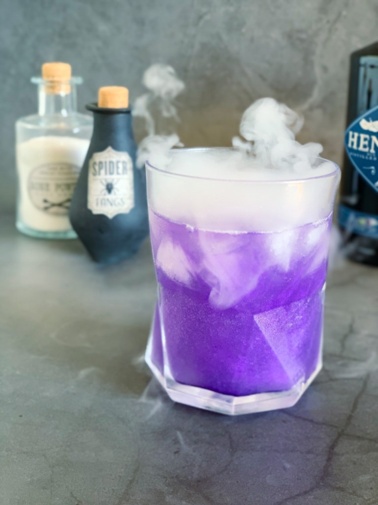 This cocktail is lightly sweet and floral with gin, elderflower liqueur, lime juice, and ginger beer. It’s a simple potion to brew, however as with most potions, the most challenging step is gathering your ingredients. So long as you are able to conjure up some dry ice and glittering purple dust, you can turn this simple sipper into a magical witch’s brew.