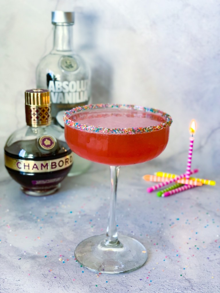 A sparkling raspberry cake cocktail fit for a birthday queen (or king)