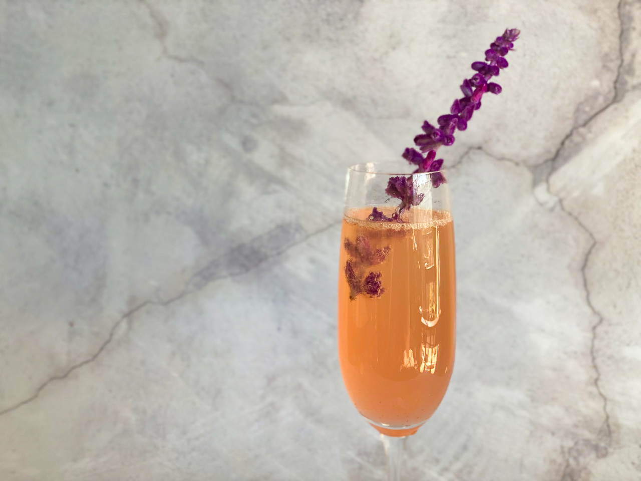 A fancy floral pink lemonade mimosa meant to be sipped at a garden party brunch with the girls